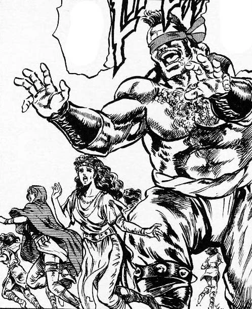 - He is not very intelligent, as he assumed that when he accidentally gave Raoh (Kenshiro, in the anime) a hug, he thought he grabbed a very strong and muscular woman that was twice his size before taking off his blindfold and immediately realizing who he grabbed hold of.