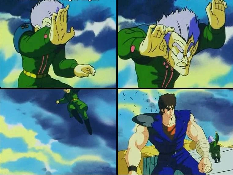 Kōshi Byoga Ken (鉱支猫牙拳, Ore Support Cat Fang Fist): The martial art style used by Komaku, one of Yuda's lieutenants. This style apparently works best in high and narrow places, particularly when used with Komaku's small size and agility. The style originated in episode 56 of the anime series and later appeared in Hokuto no Ken: Shinpan no Sōsōsei: Kengō Retsuden. |
