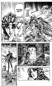 In the near end of the series, Bat refuses to live a lie and erases Lin's memory with his limited Hokuto Shinken. Kenshiro also loses his memory during a fateful thunderstorm, and Bat arranges for the two to be reunited while he stakes his own life against Bolge, a minor enemy from Kenshiro's past journey. Lin and Kenshiro recover their memories, only to find Bat has been mortally wounded in the fight. As a dying wish, Bat tells Lin to spend her life with Kenshiro, the man she loves. Lin respects his wish, only to have a change of heart and return to Bat's side. To her wonder, she finds Bat has survived, thanks to Kenshiro's powers.