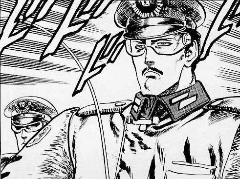 The Major (少佐 Shōsa) was a Golan commando who used a razor sharp wire garrote that could decapitate people, as well as throwing knives. Kenshiro defeated Major with the Hokuto Sokin Jizai Kyaku, which forced the Major to decapitate himself.